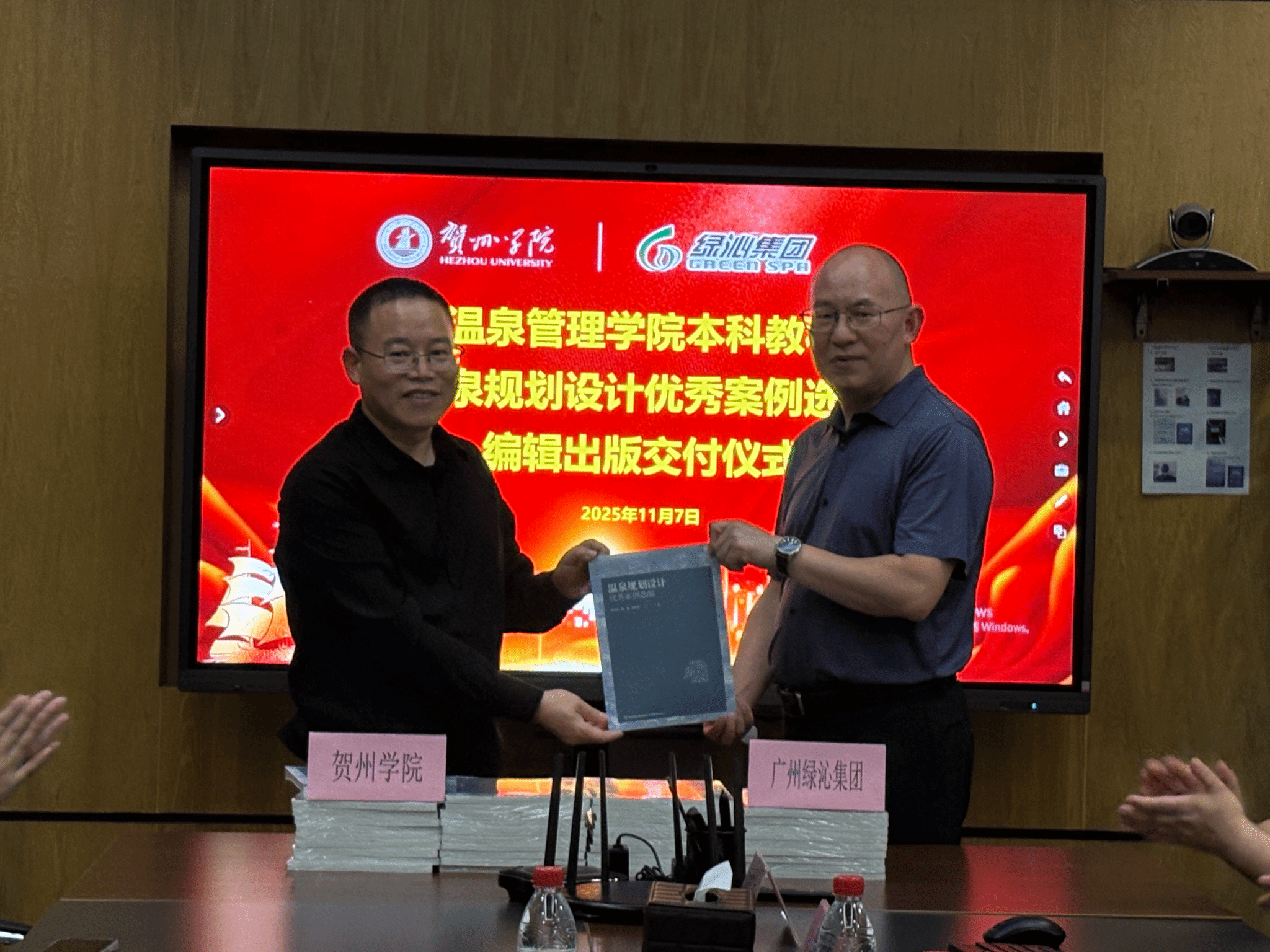 2025年11月7日,由贺州学院温泉管理学院与广州绿沁集团联合编写的教材《温泉规划设计优秀案例选编》出版交付仪式在广州绿沁集团总部隆重举行。杨主泉院长、王西祺副院长以及杨进董事长、杨彬副总裁等领导参加仪式。