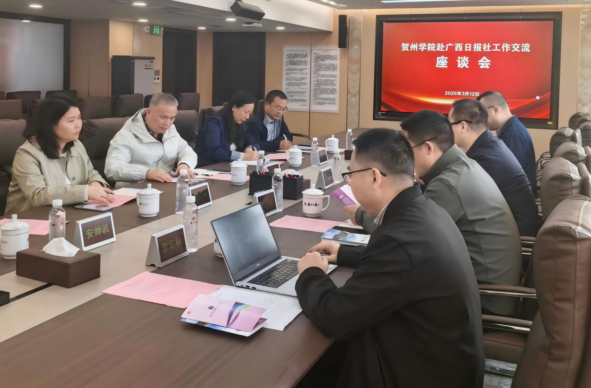 在广西华千谷体育服务有限公司,双方聚焦体育赛事运营、体育培训、体育康养等方向,探讨校企协同培养应用型体育人才路径,助力体育强国建设。在广西日报社、超星集团、广西农垦集团、五象投资资产管理部,深入了解文旅宣传、课程建设等复合型岗位要求,推动学院跨学科融合培养,提升毕业生综合竞争力与岗位适配度。