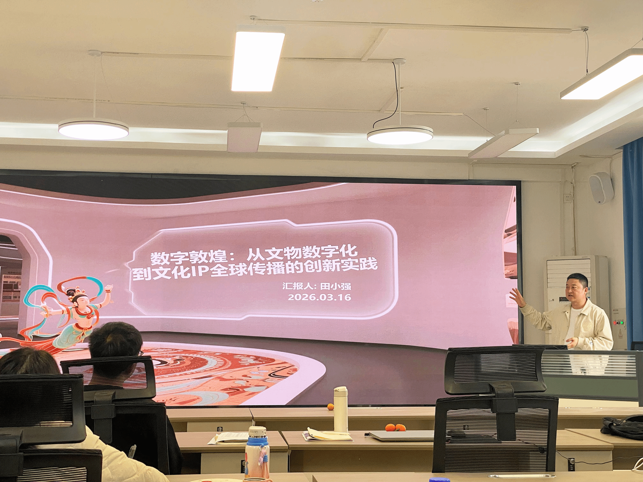 3月16日上午,我院在逸夫楼215多媒体教室举办“数字敦煌:从文物数字化到文化IP全球传播”专题讲座,特邀敦煌研究院团委副书记田小强担任主讲。全体25MTA学员参加讲座。