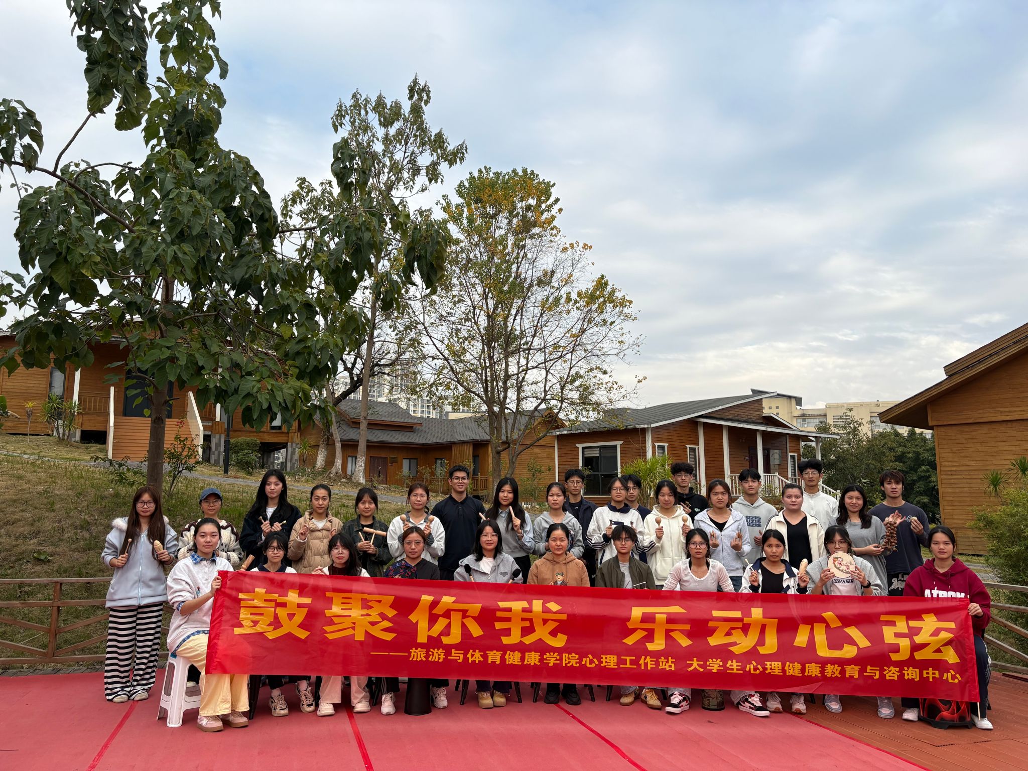 为减轻学生心理压力,培养积极向上的心态,12月2日,我院心理工作站联合学校大学生心理健康教育与咨询中心在旅游实训中心(小木屋)举办题为“鼓聚你我 乐动心弦”减压鼓圈心理育人活动。本次活动由校心理咨询中心的曾老师担任鼓圈引导师,46名学生报名参与此次活动。